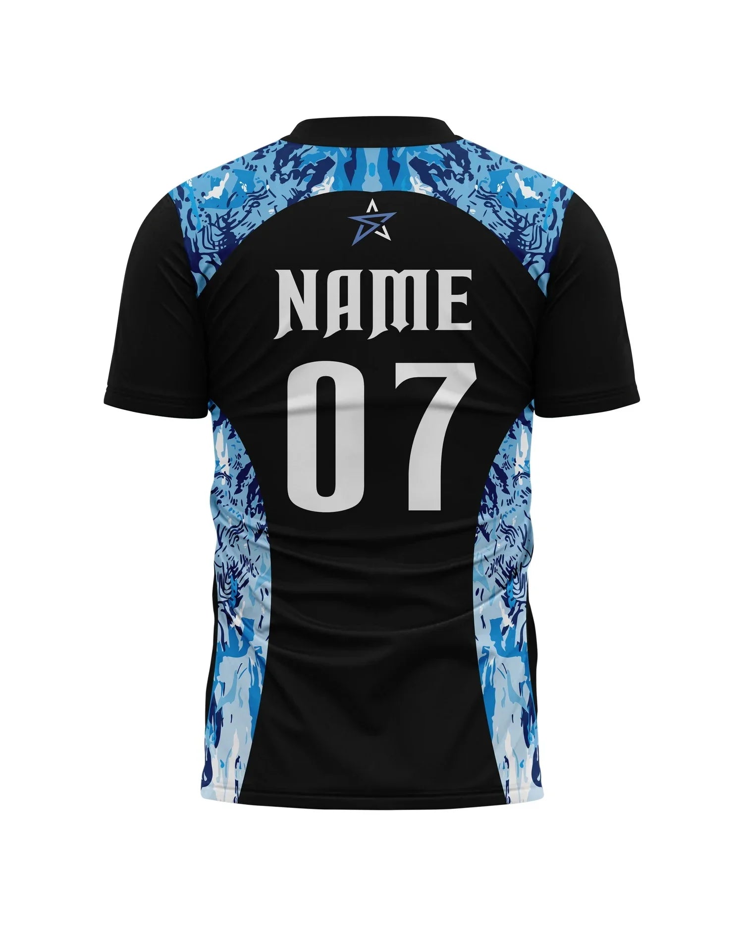 Elevate your wardrobe with the personalized Blue Edge Star, combining style and customization in one striking package. This outfit features a shirt paired with trousers for a sleek, refined look. The bold black color is accentuated by vibrant blue side panels with digital printing while customized t-shirt and trousers both showcase star details—on the left chest and left leg respectively. Ideal for making a statement, this apparel allows you to add a personal touch with customized names and numbers. Stand out in fitness fashion with the blue edge star, where your style and personalization come together seamlessly