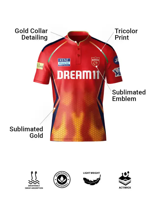 Elevate your match-day experience with the Punjab jersey, crafted for ultimate comfort and style. Made from lightweight embossed fabric with Actiwick technology, it ensures you stay cool, dry, and comfortable throughout the game. The sleek Mandarin collar with golden piping adds a touch of elegance, while the sublimated PBKS logo, tri-color design, and striking golden stripes perfectly replicate the official team jersey.